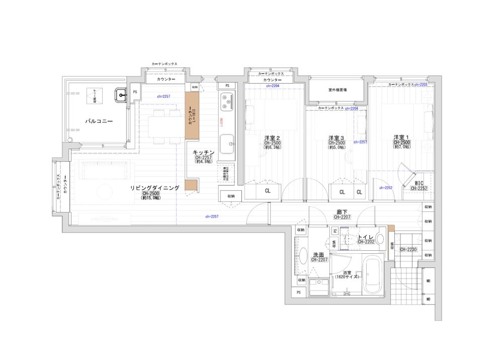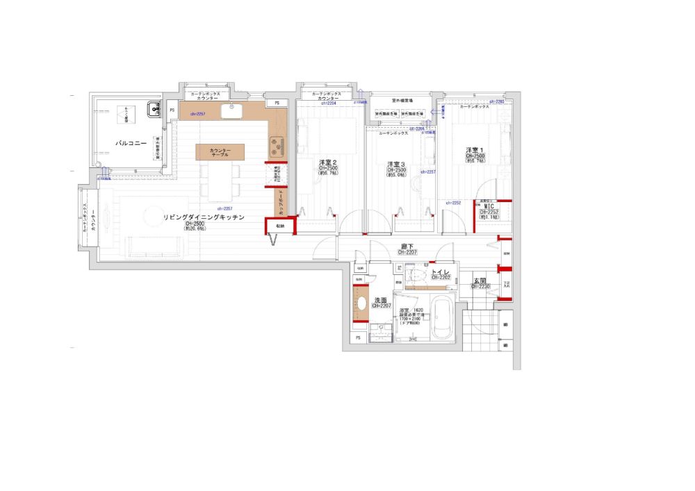 壁面を大胆にキッチンにする事により幅2990×1390と何を作るにもスペース十分なL型キッチンへと変身。