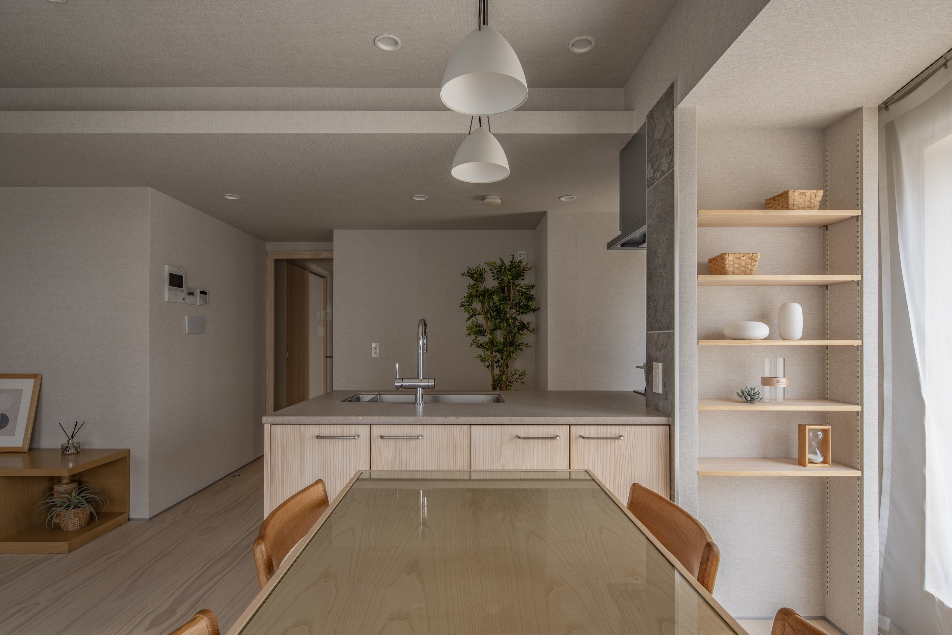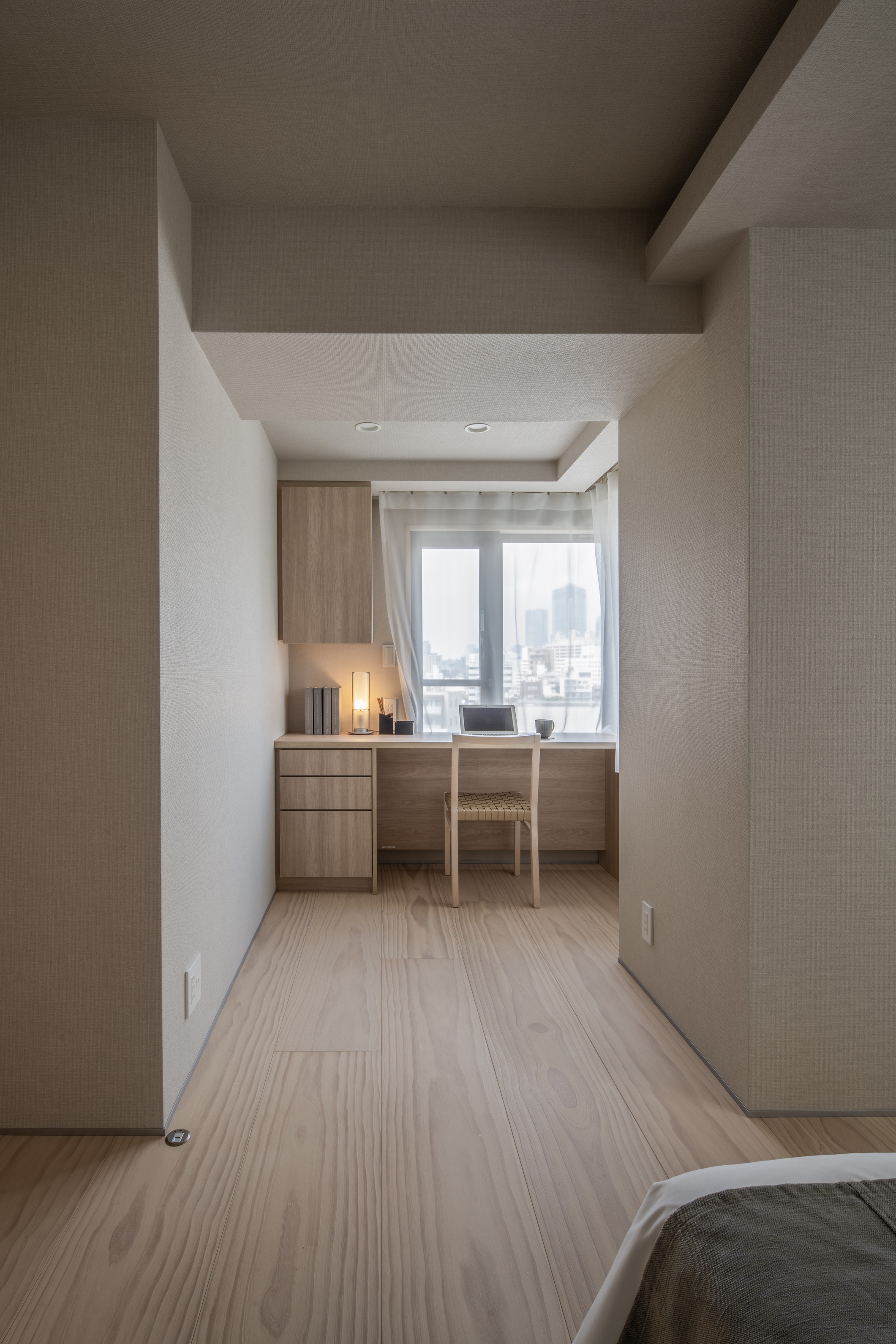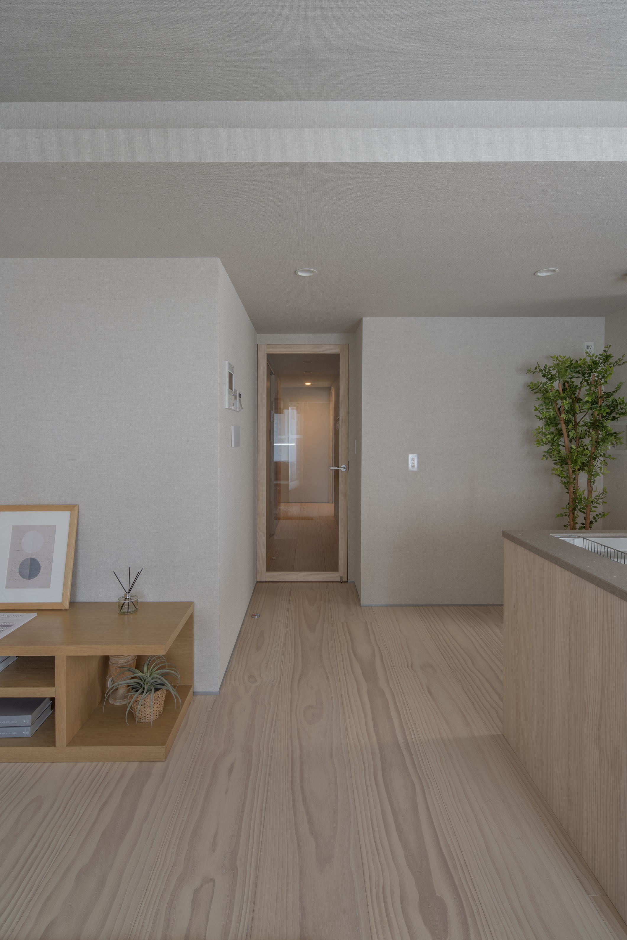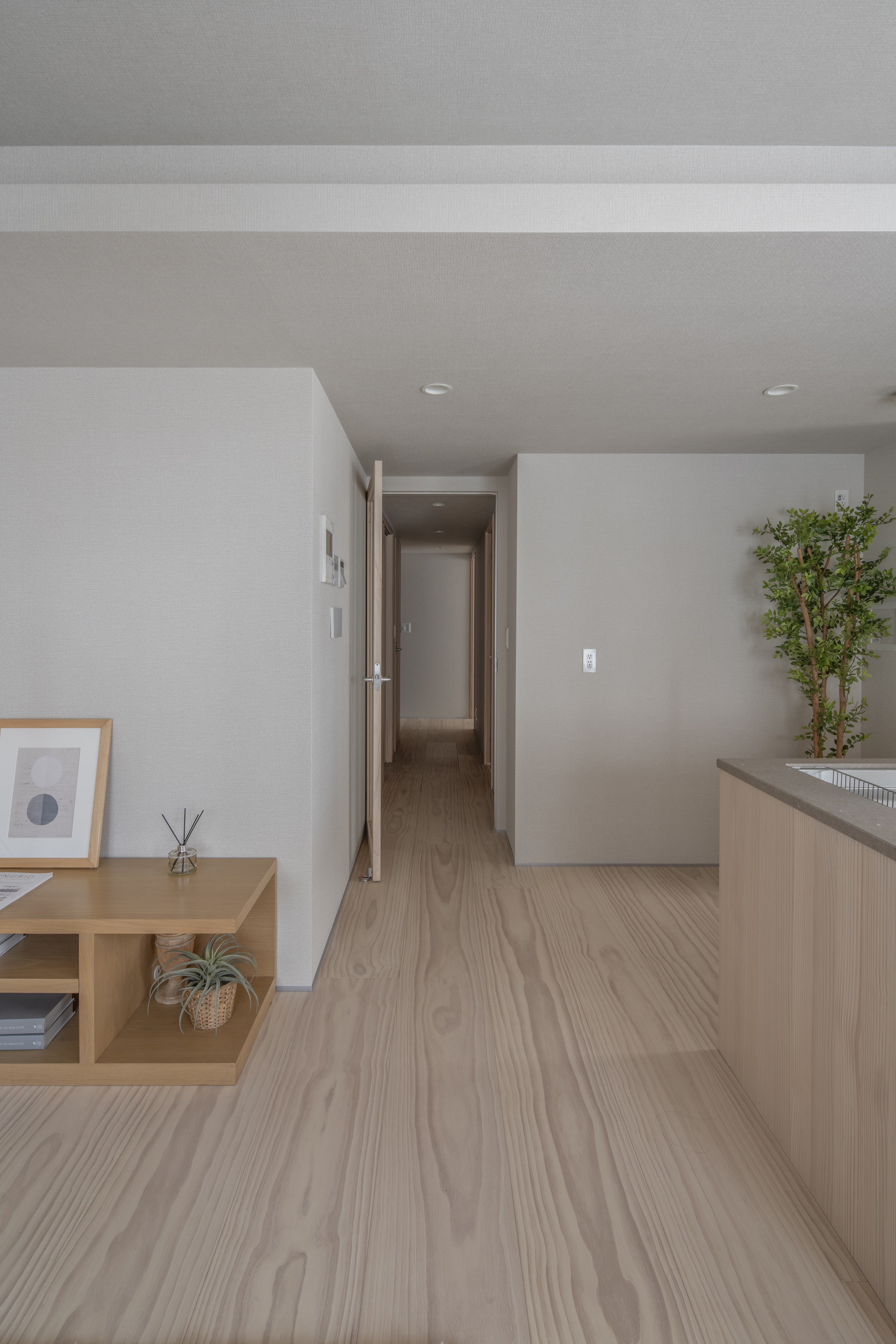 東京都心エリアのマンションの高額化が進んでいる。マンションの開発会社は値段に見合うよう、ガラス張り、タイル仕上げ、大理石など、こぞって高級感のある演出に力をいれている。今回の設計ではそんな流れと逆行するように、ナチュラルで木のやさしさを感じられる、時代に流されない空間を目指してプランニングした。ナチュラルな中にも洗練された素材を選定することで、エリアに見合うグレードを感じられる空間にできるように工夫した。