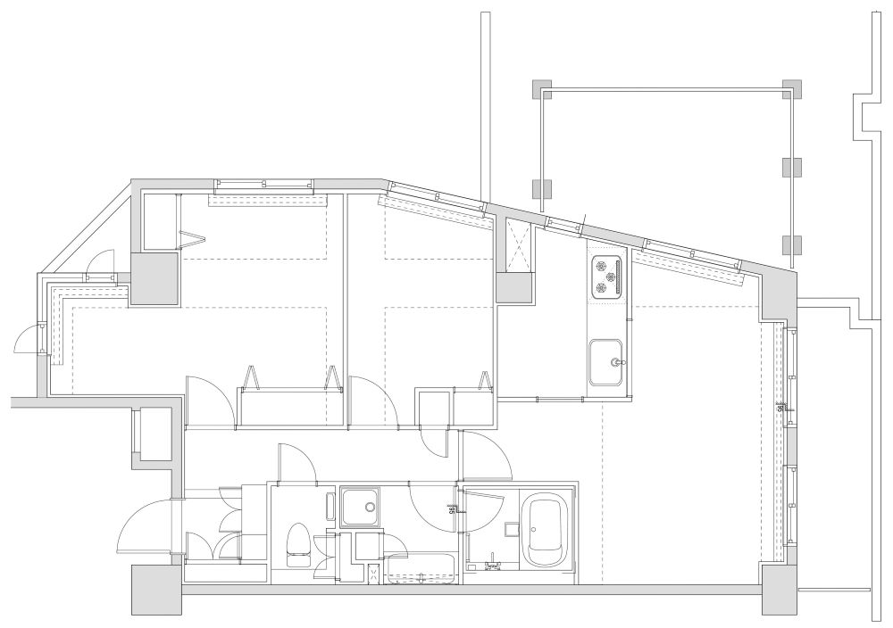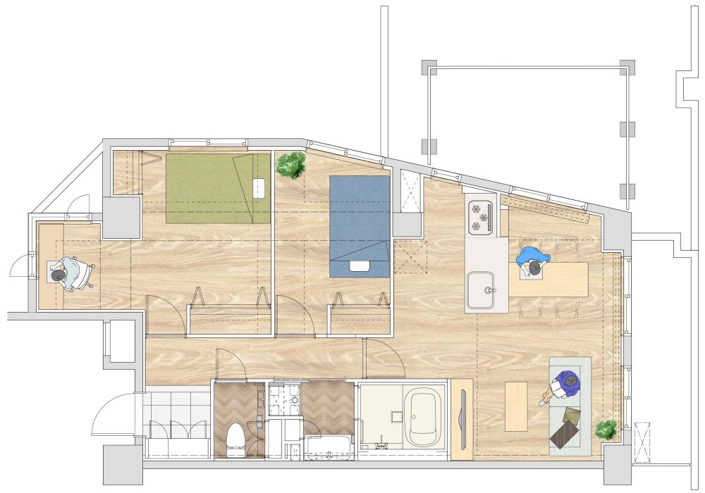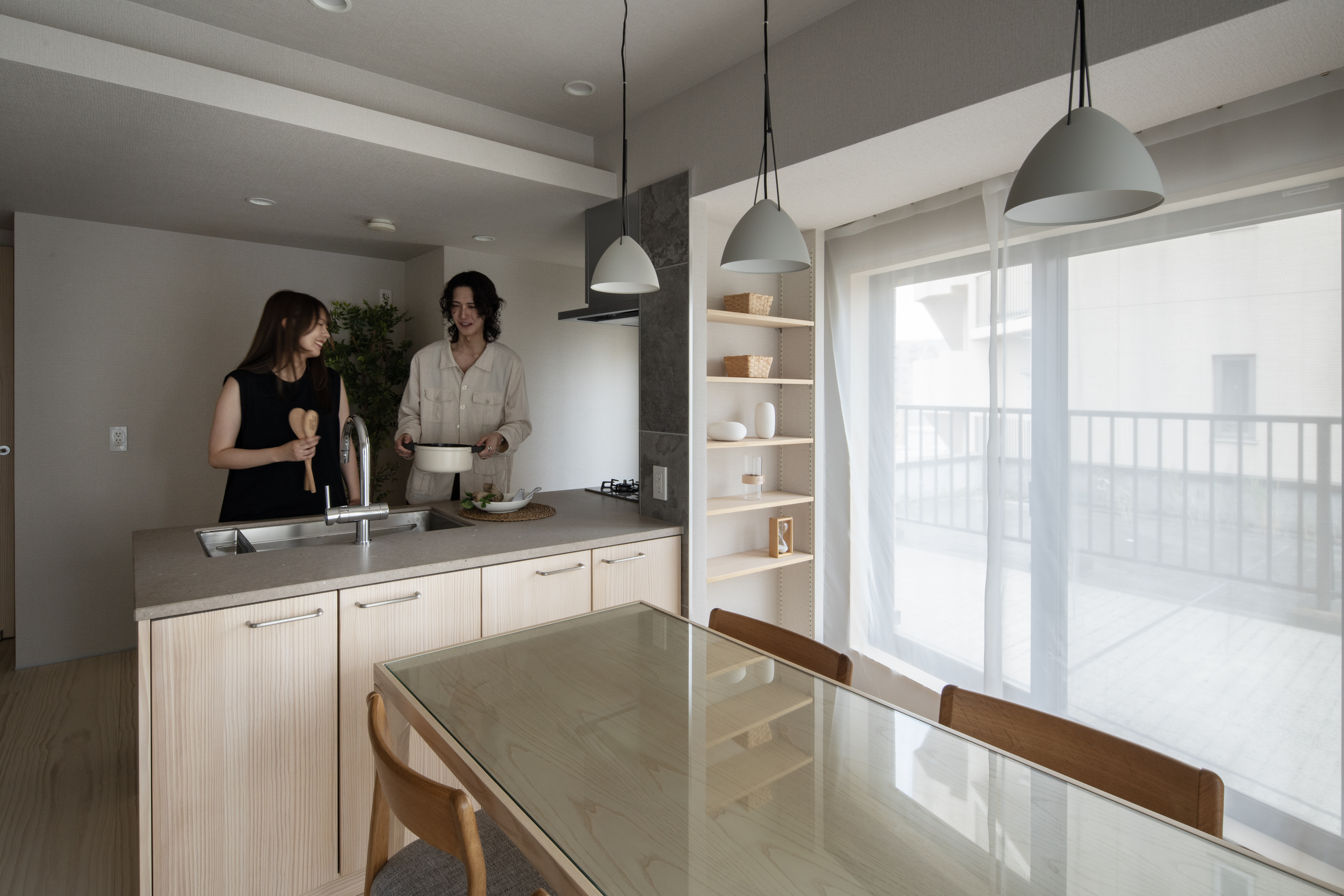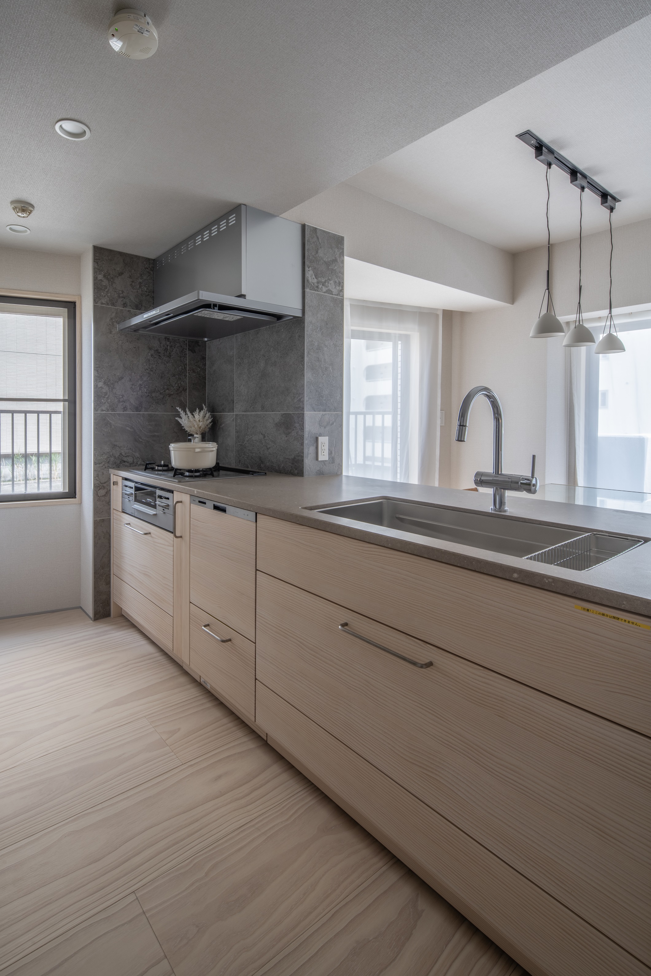 東京都心エリアのマンションの高額化が進んでいる。マンションの開発会社は値段に見合うよう、ガラス張り、タイル仕上げ、大理石など、こぞって高級感のある演出に力をいれている。今回の設計ではそんな流れと逆行するように、ナチュラルで木のやさしさを感じられる、時代に流されない空間を目指してプランニングした。ナチュラルな中にも洗練された素材を選定することで、エリアに見合うグレードを感じられる空間にできるように工夫した。