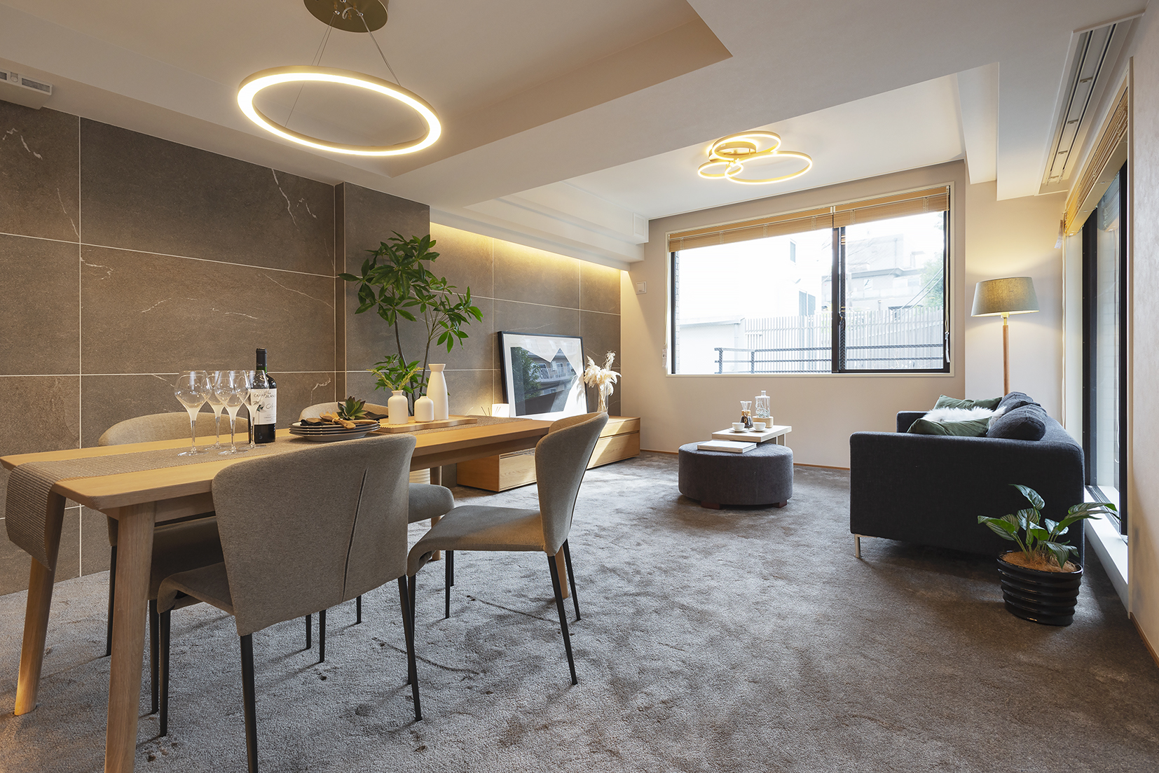 ホテルライクになりがちなカーペット床に突板を組み合わせることで、洗練された高級感と住まいらしい奥行きを同時に実現しています。