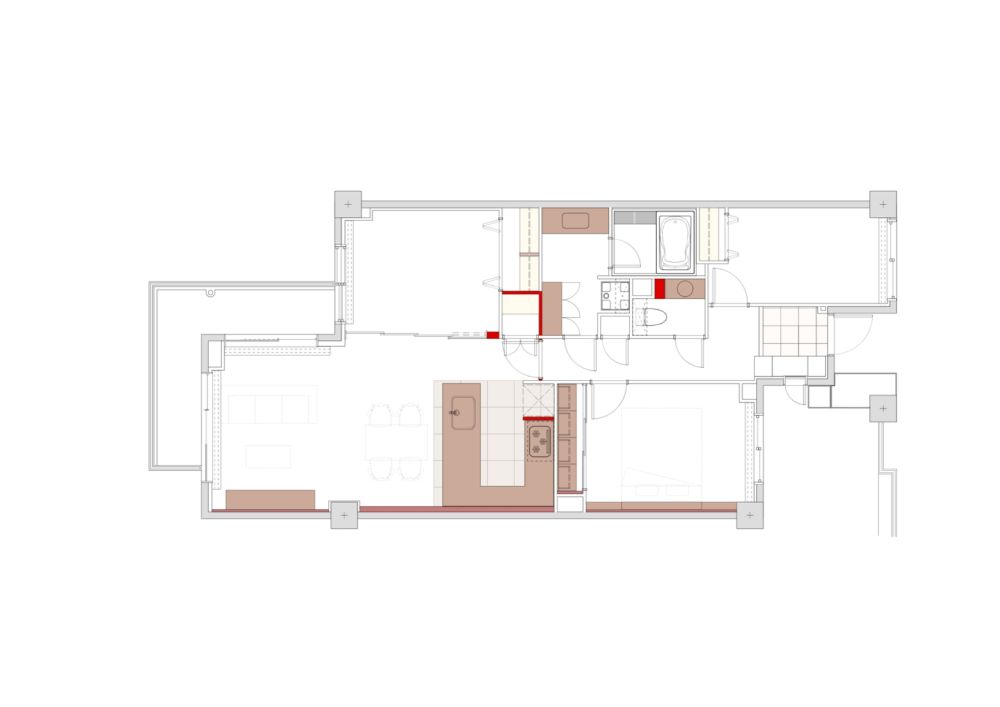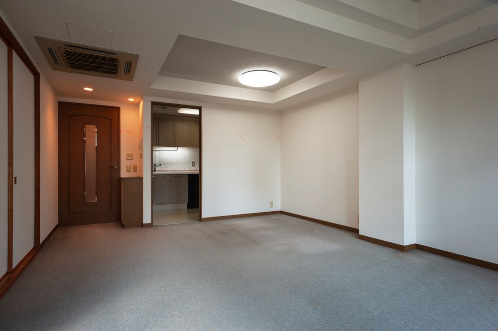 床の仕上げがカーペットのみの物件の為、住宅設備の大部分を素材感を出すよう突板の面材にしました。