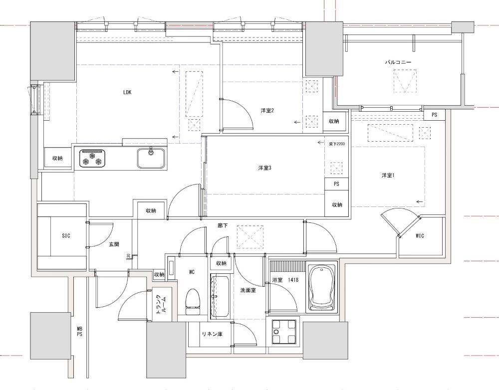 • ペルソナは**独身男性またはDINKs(共働き夫婦)**を想定。LD横にはガラス建具で仕切れる洋室を設け、多様なライフスタイルに対応できる柔軟な空間とした。