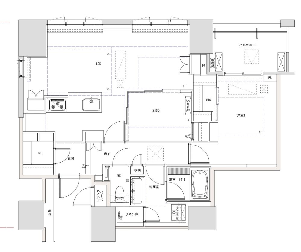• 間取りを3LDKから2LDKへ変更し、広々としたLDKを実現。
