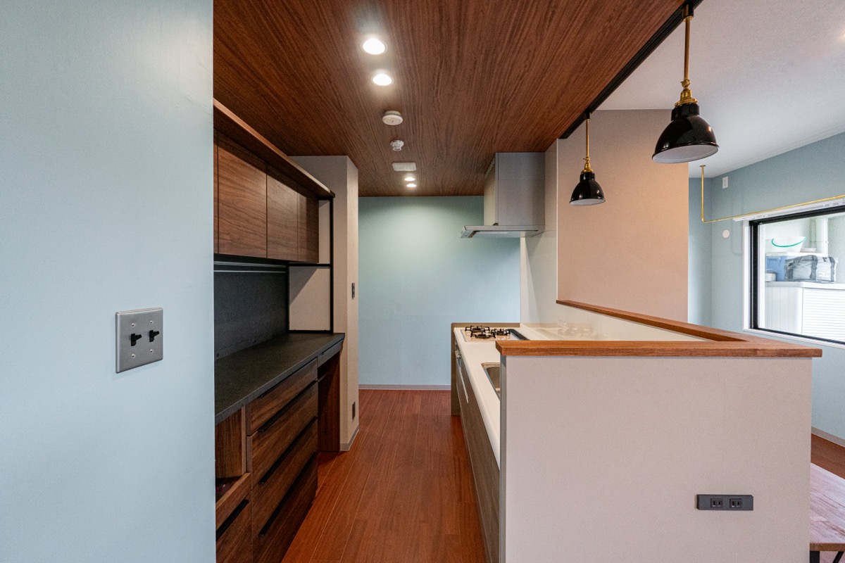 キッチン前の壁をなくして圧迫感を解消し、室内窓で奥行きを演出。さらに壁全体を水色に仕上げることで、憧れていたドラマのような世界観を楽しめるリビングになりました。機能性とデザインが融合し、毎日が気持ちよく過ごせる空間へと生まれ変わりました。