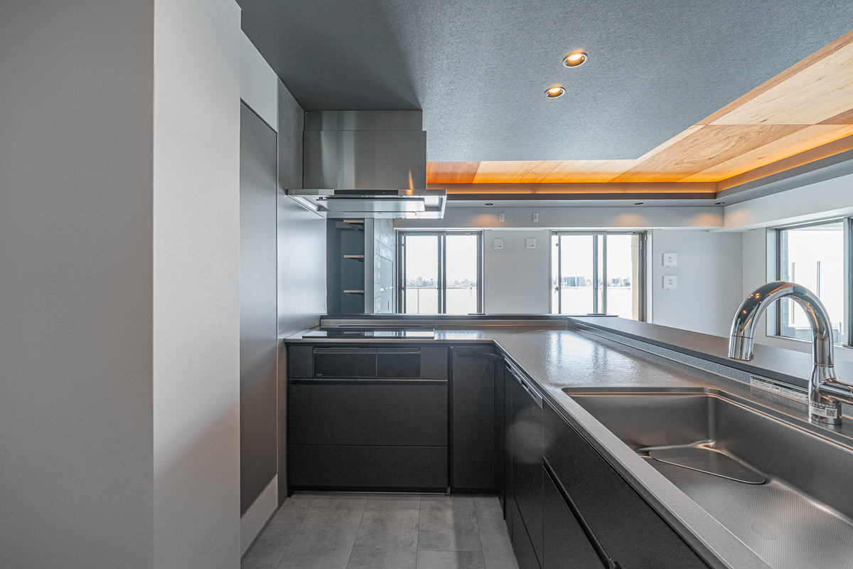 黒を組み合わせたステンレスキッチンは、動線の短さと収納力を両立。