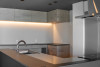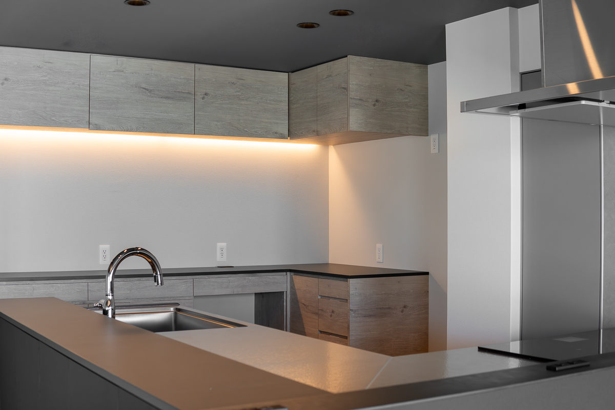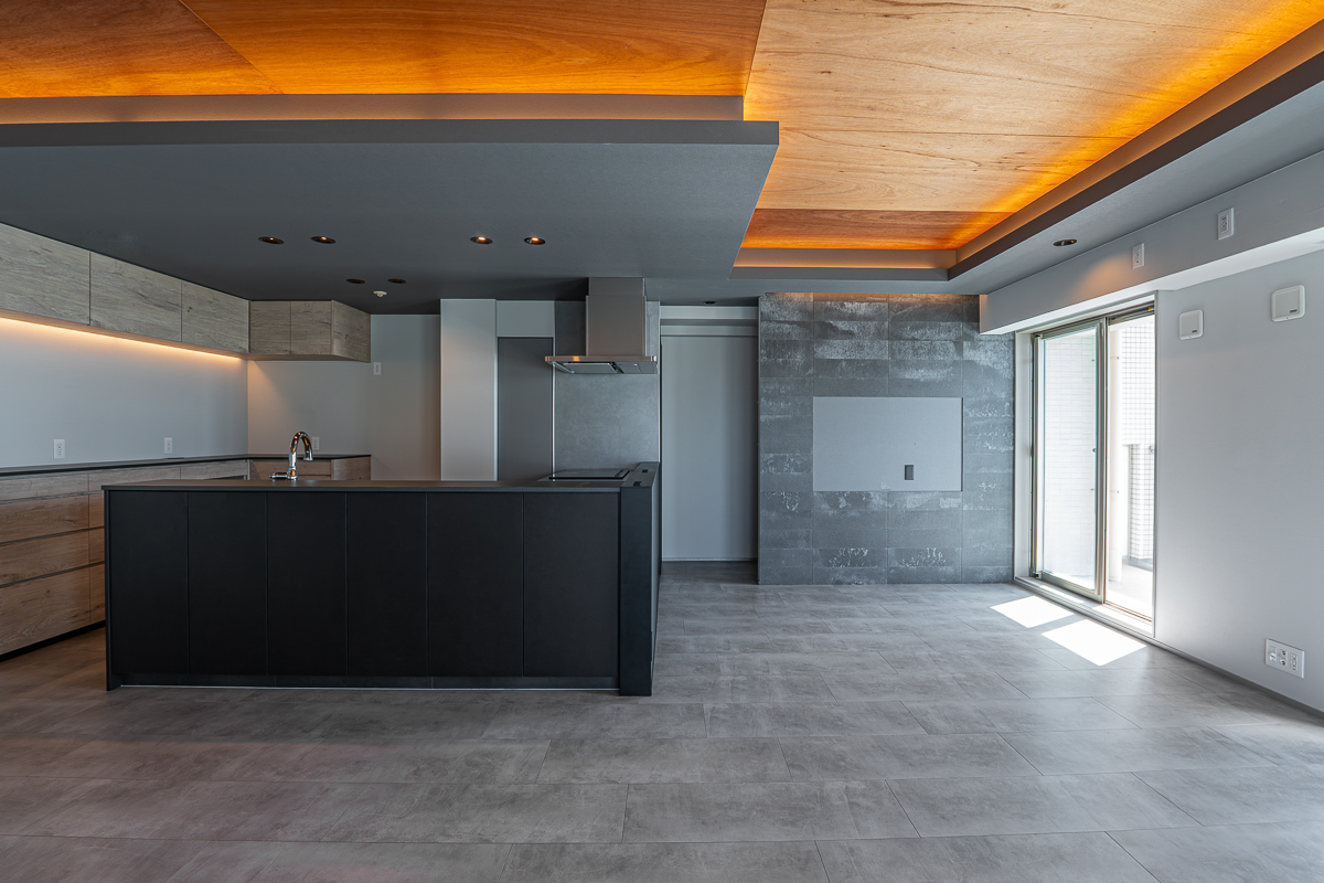 間接照明が素材の表情を引き立て、どの時間も心地よく過ごせる住まいに。