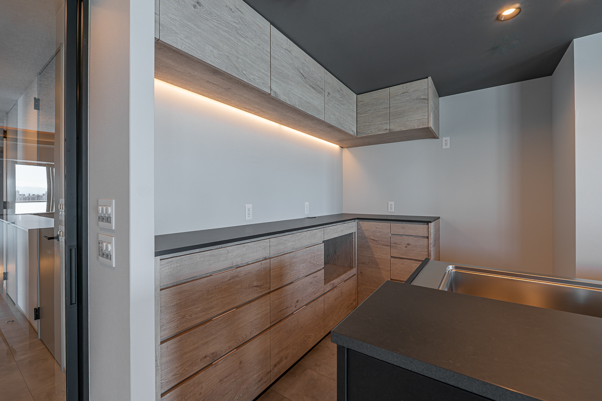 キッチン横には、木目の扉とダークグレーの天板を組み合わせたオリジナルのカップボードを造り付けました。