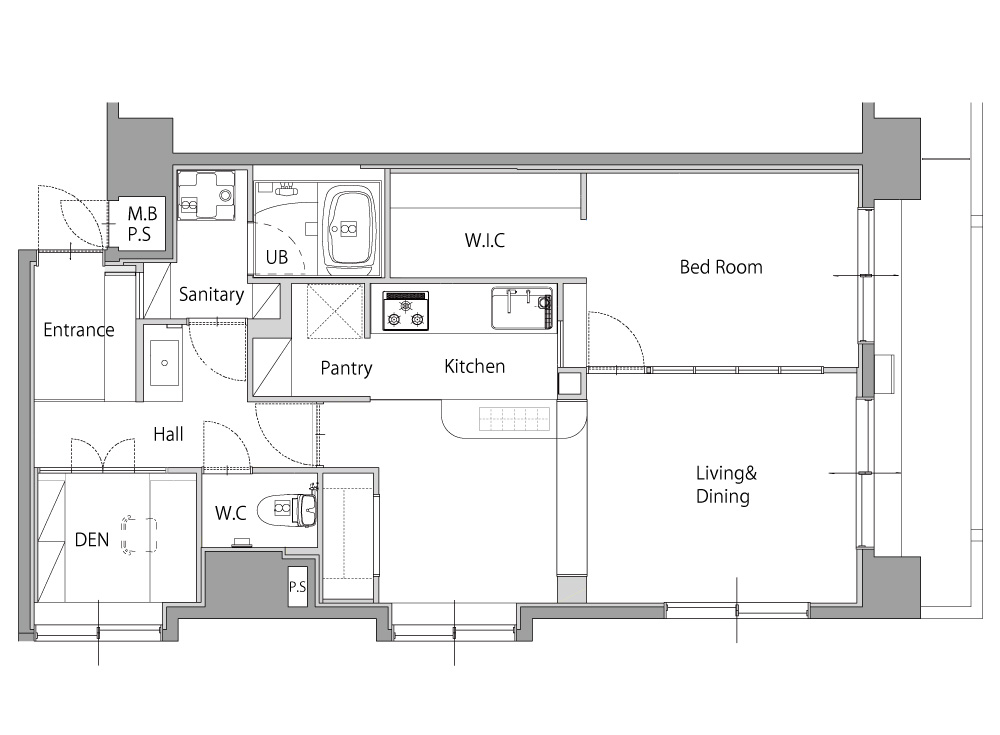 お気に入りのモノが暮らしの一部となる、施主様のお住まい。 山登りが趣味の奥様と、カメラを楽しむご主人。おふたりでキャンプにも出かけるというライフスタイルが、そのままインテリアにも表れています。 キッチンカウンターの棚にはご主人のカメラを、ワークスペースの壁には奥様の登山ギアを引っ掛けて収納。 趣味の道具が空間を彩りながら、見せる収納として整理のしやすさも実現しました。 日当たりの良い角部屋の窓際ではグリーンがすくすくと育ち、出窓のカウンターには旅の思い出を並べて、眺めを楽しめる心地よい場所に。 LDKの一角にあるヌックはコンパクトでおこもり感を演出しながら、内部に本棚を、ベンチ下も収納として活用できる実用性も確保しました。 また、リビングダイニングを横断する大きな梁には、梁下に沿って木製の大きなアールを設け、圧迫感を重厚なデザインに変える工夫を加えています。 住まいの象徴となる大きなアールが空間をやわらかくゾーニングし、ヌックの開口部に施した小さなアールとリンクすることで、全体にやさしい統一感を生み出しました。 透明な境界で区切りつつも光が巡り、アール越しに見える景色が何気ない日常も少し特別に感じさせてくれます。
