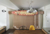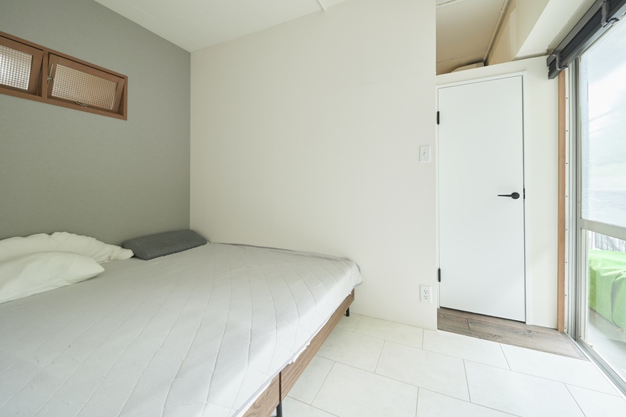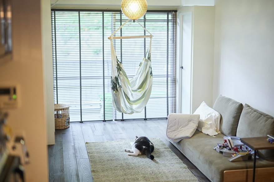 13年前、シンプルハウスにリノベを依頼されたご家族のリクエストは、主寝室1つ、子供部屋2つ、計3つの独立した部屋とLDKでした。個室は1列に配置し、子供部屋2室にはベッドとなるロフトを設け、廊下を排除。個室とLDKをダイレクトにつなげ、空間を最大限に有効化しました。ズドンと真ん中に位置するキッチンからはご家族の様子が見渡せます。T様ご家族の入居にあたり、間取り、設備機器、フローリング等、大部分はそのまま再利用。新たに少しだけカスタマイズを施します。一緒に暮らす猫ちゃんたちの毛が寝室に入り込まないように、寝室には建具を設置。お子さんが早く寝るのもあり、リビングと寝室は分離させます。キッチンの壁側に2つ棚を、テレビの上にはスピーカーを置くための棚を造作しました。さらに、猫ちゃんへの配慮も。猫ちゃんが洗面所のトイレに出入りしやすいよう、壁の低い位置にかわいいサイズの開口部を設けました。ロフト付きの子供部屋だった2室。T様は現在、ご夫婦の収納、お子様の収納と分けて使用されています転勤による引っ越しのたびに、サーフボードを手放されてきた旦那さま。新たにディスプレイラックを設け、最後まで手放さなかった、愛着のあるサーフボードをインテリアとして楽しみます。家の真ん中にあるキッチンの周りを走るのを楽しまれているそう。それをご両親が追いかける遊びが『まてまてしよう』。この家ならではの、合言葉ですね。
