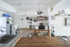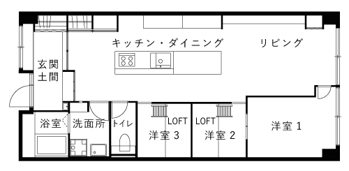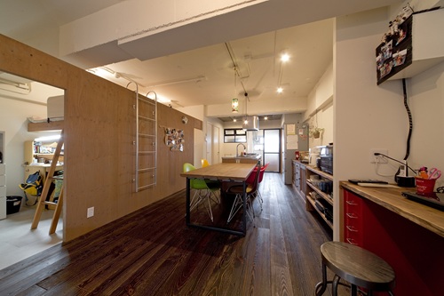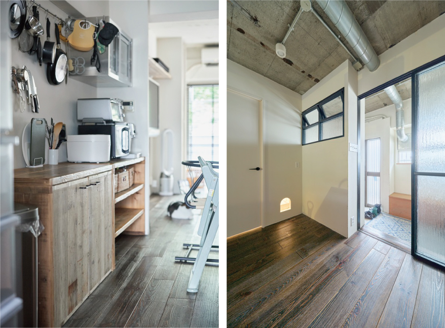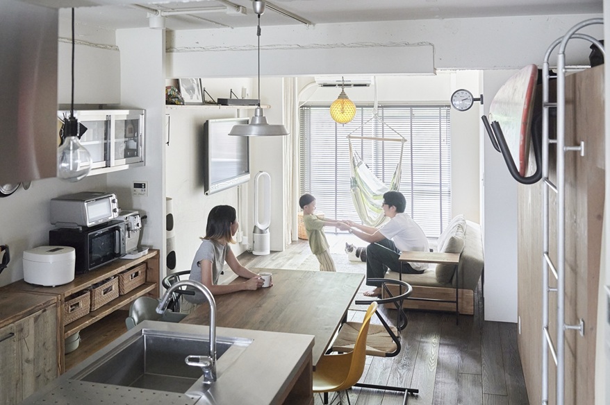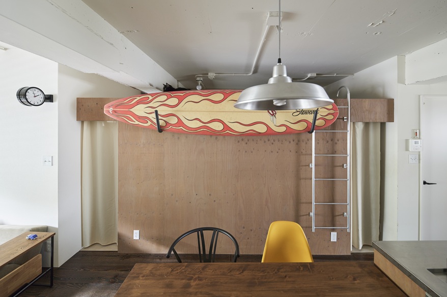 「ここしかない!」とT様が心を決めたのは、内覧案内担当者と別れた直後。「普通じゃない感じが気に入って、すぐに購入の電話をしました」。T様を虜にしたのは、シンプルハウスが別のご家族向けに手掛けたリノベーション物件。13年間お住まいだったご家族は大変愛着を持たれていましたが、やむを得ない事情でお引越しされることに。売り出しになったばかりのこの物件、いち早く発見し、内覧を最初に申し込まれたのがT様でした。T様はリノベを想定して、中古物件を探してはいませんでしたが、ボルドーパインの一枚板のフローリング、剥き出しのコンクリート、黒いフレームの室内窓と建具、LDKのどこにいてもお子さんの様子を見渡せる間取り、リノベならではの要素に、すっかり夢中に。長年愛用されているサーフボードをディスプレイするのに、ぴったりの空間でした。階下が駐車場のため、お子さんが自由に動き回れる点もお気に入りです。