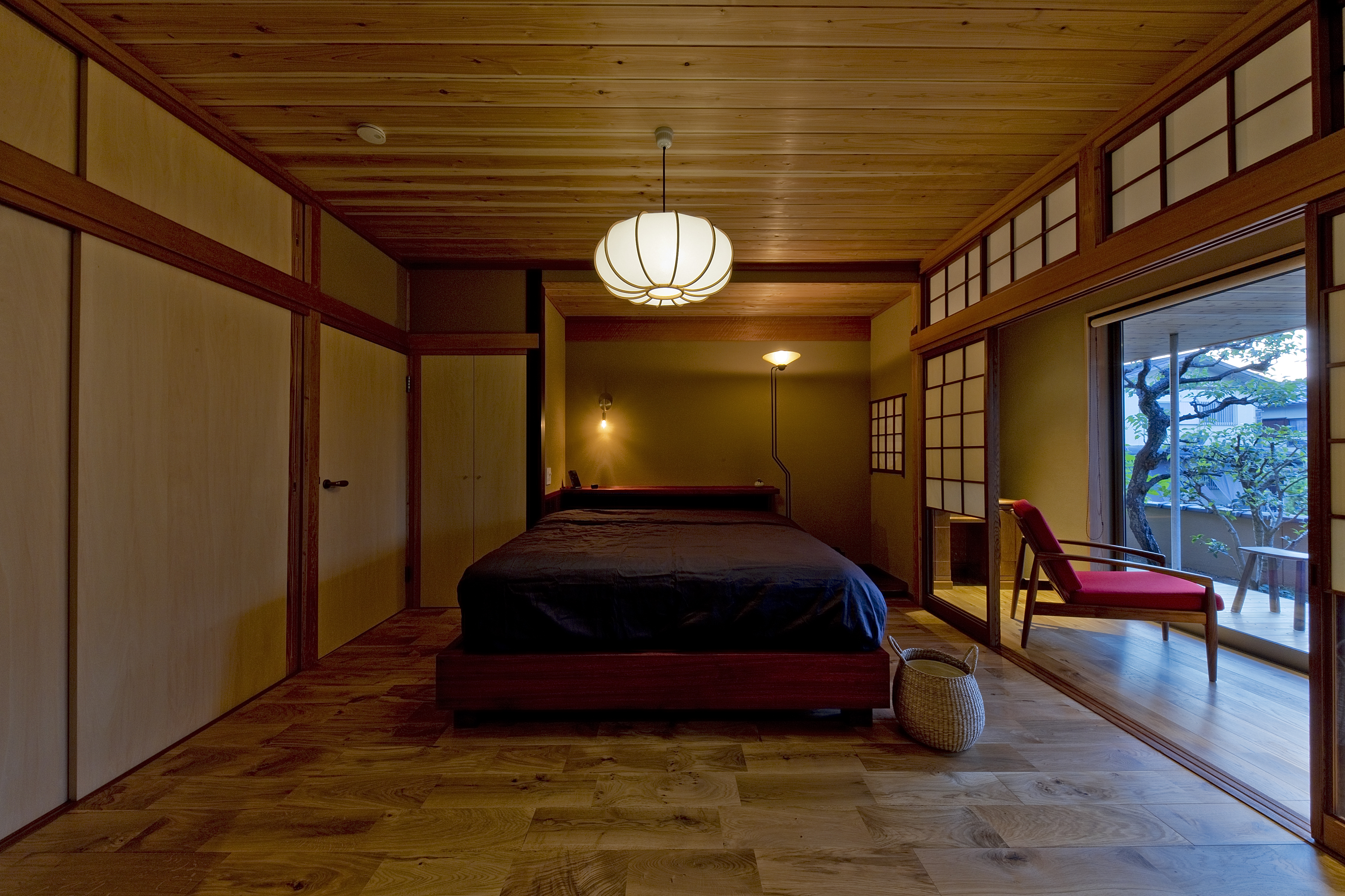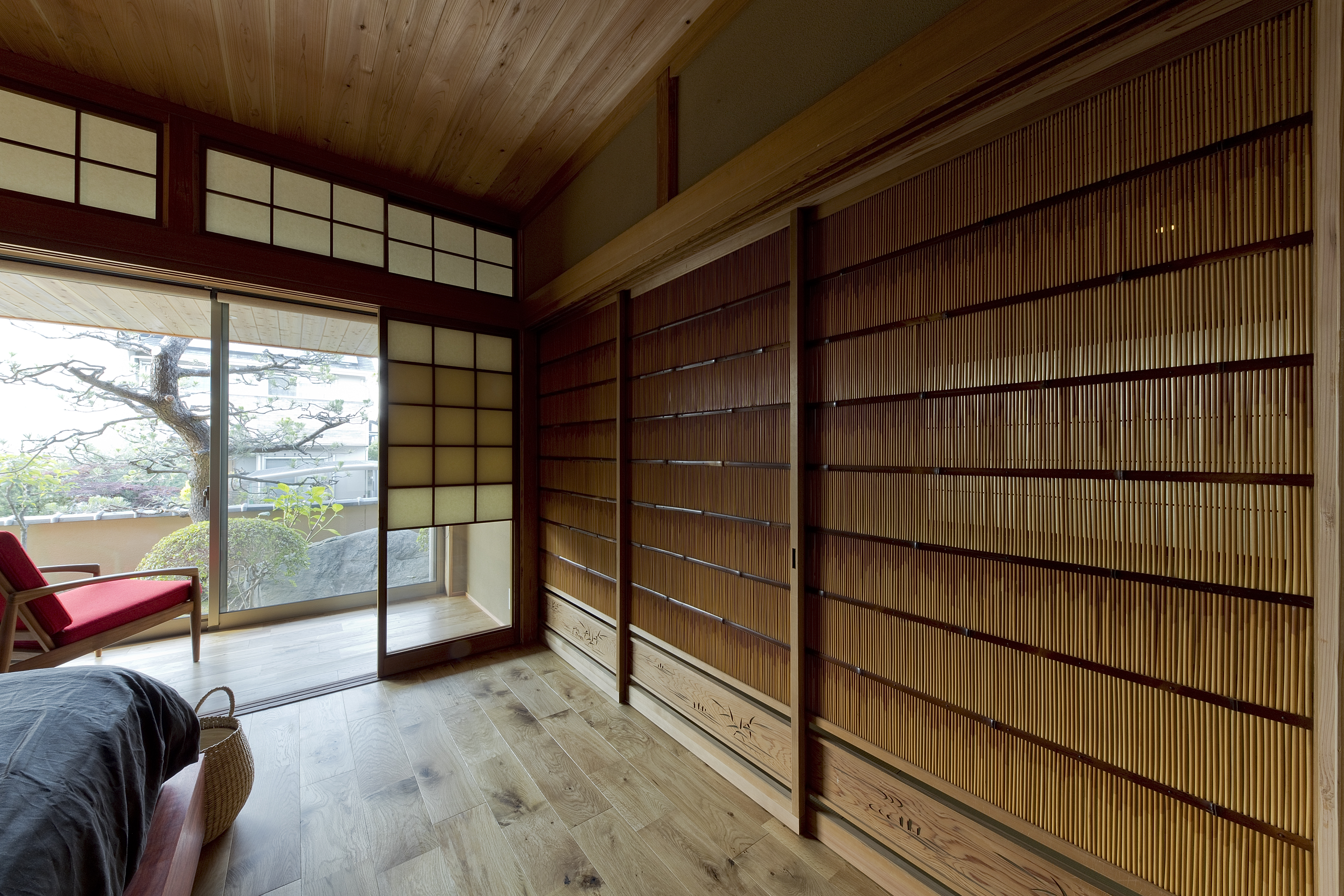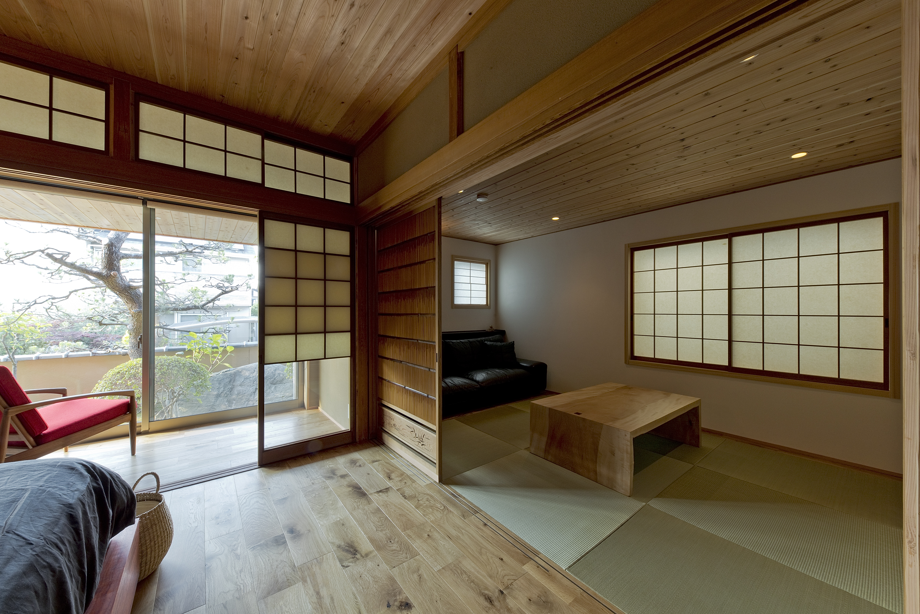 縁無しの畳に障子、寝室との間を仕切る引き戸には古い葦戸をリメイクして採用。