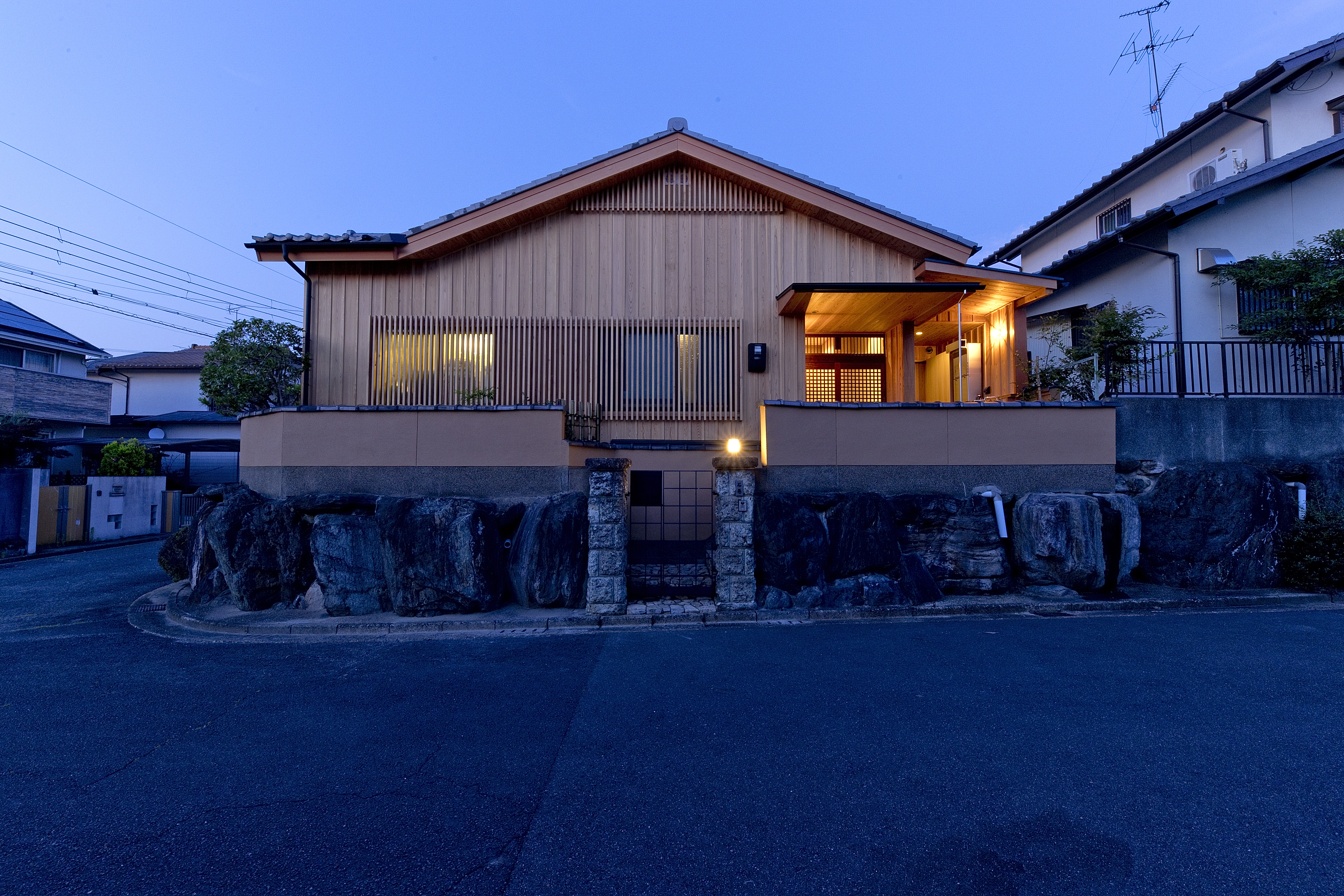 古い平屋住宅のリノベーション。押し縁張りで仕上げた凹凸のある杉板の外壁に重厚感のある瓦屋根、