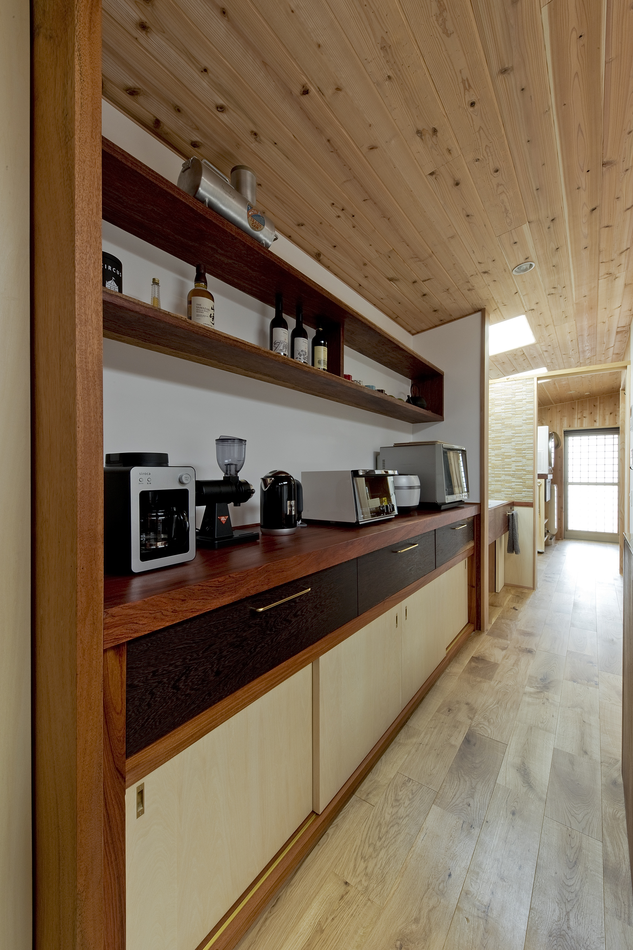 築約50年の木造平屋住宅をフルリノベーションしました。元々はご家族5人とペットの愛犬と住まわれていた家でしたが、お子さまが巣立たれご夫婦とペットの暮らしになったことから、今ある住まいを有効活用しフルリノベーション。無垢材をふんだんに使用し、和モダンなデザインを活かし全体をワントーン低くしたことでまるで旅館に来たような大人の上品さが感じられる雰囲気に仕上げ、終の棲家としてゆったりと過ごせるようになりました。もちろん耐震断熱の補強はしております。