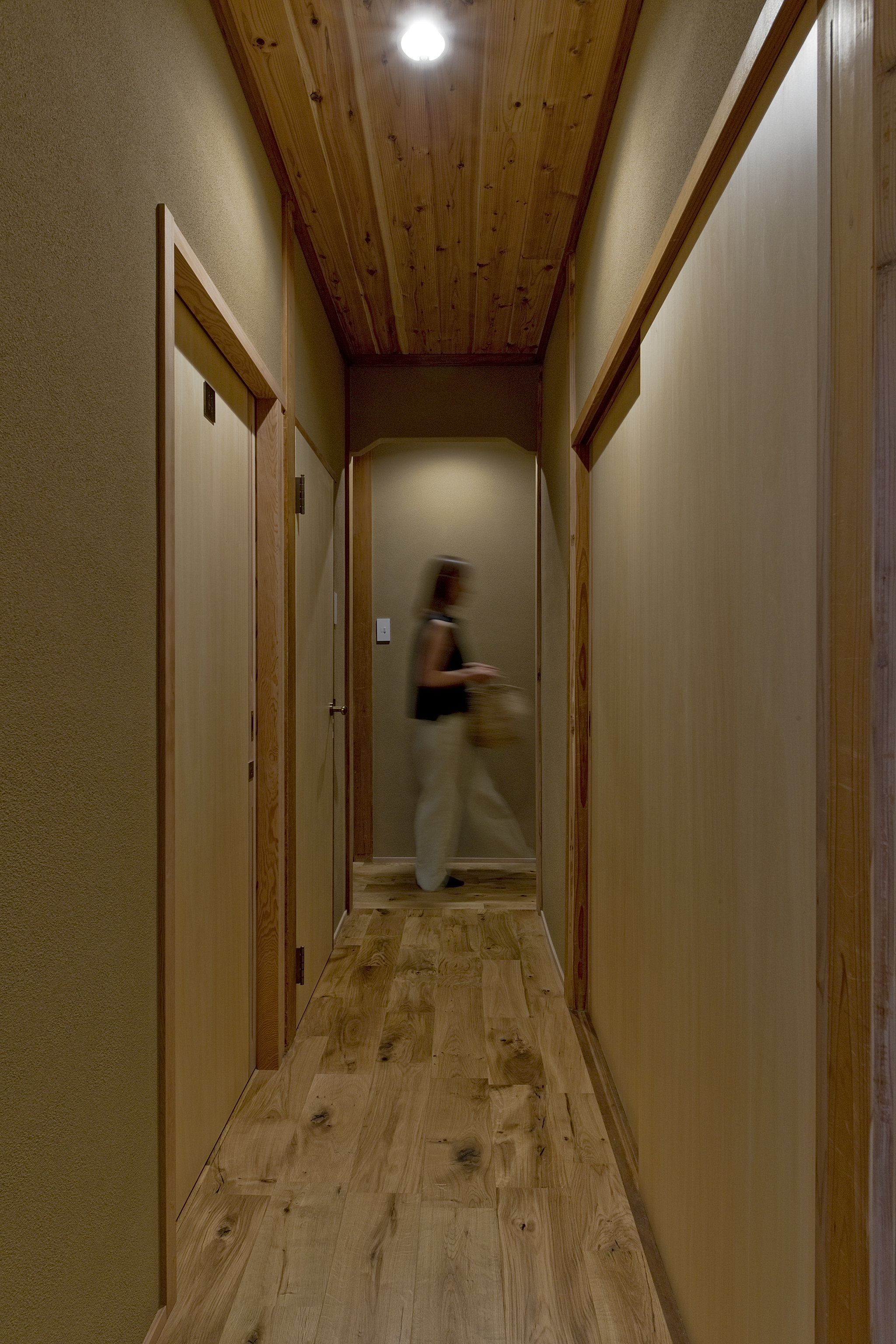 廊下はあえて天井を低く設定し、垂れ壁を設け、照明も控えめに計画しています。