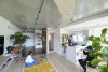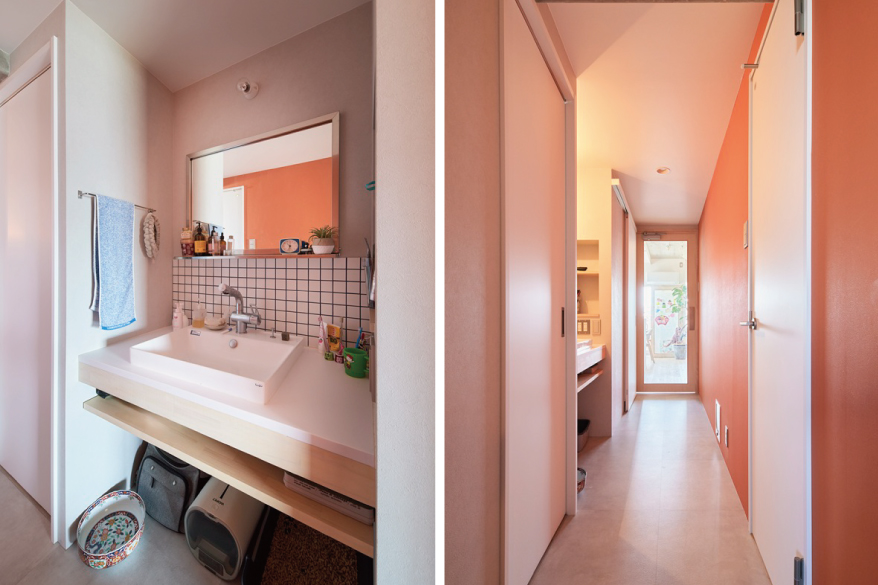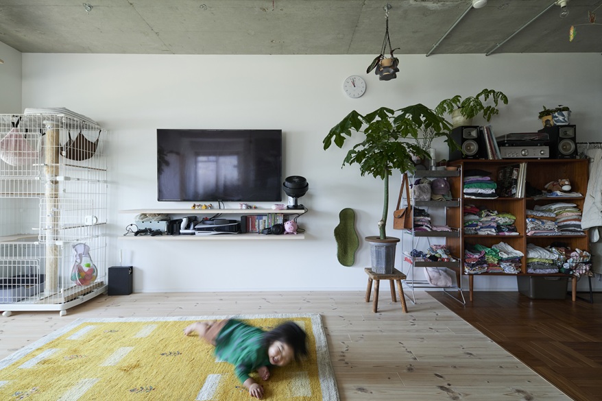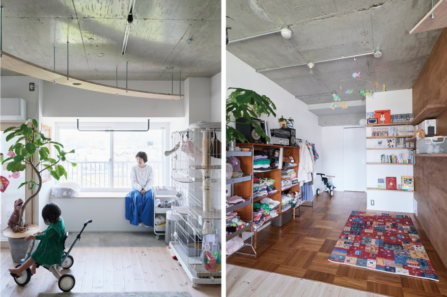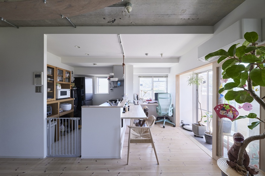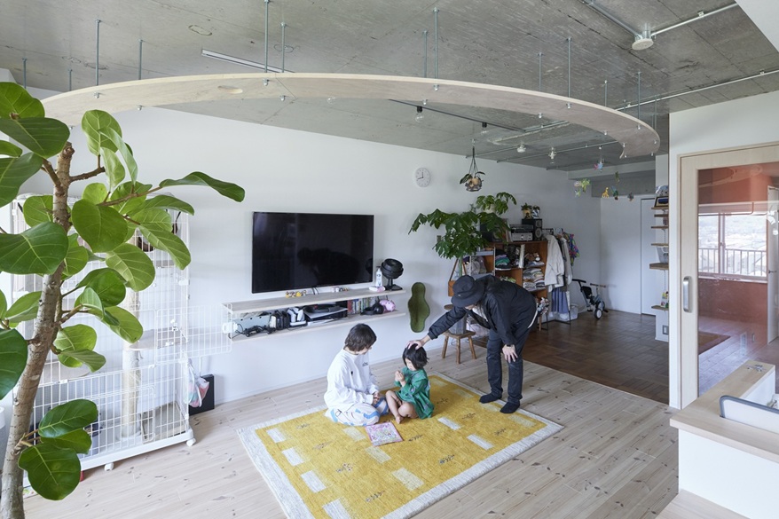 K様が目指したのは、人間も猫も、一緒の空間にいながらのびのびと暮らせる環境。部屋から部屋へキャットウォークを巡らせたい、他が直線的だから、造形は曲線的に、そんな思いで実現したのが、大きな弧を宙に描くキャットウォークです。ダイニングはリビングの一角に、添える程度にコンパクトに。対面型キッチンの向かい側に造作したキッチンカウンターに、三人並んで食事をいただきます。ソファもテーブルもあえて置かないリビング&ダイニングとつながるのは、床材を切り替えたフリールーム。お子さんも猫ちゃんたちも、障害物の無い広い空間を自由に駆け巡ります。家族3人で寝るのもこの空間。「どこに行っても家族がいて、猫ちゃんが目に入ってきて癒されます」と奥さま。就寝時は、猫ちゃんもお布団までやって来てくれるのが、とても嬉しいのだそう。「自然が見えるので、家の中にいても自然にいるみたい。リノベした空間を見て、毎日『かわいい、かわいい」と思っています」微笑みながら語る奥さま。お子さんがにぎやかにしていても、キャットウォークが猫ちゃんたちの逃げ場にもなります。人間と猫ちゃんの、つかず離れずの適度な距離感が、同じ空間で過ごすのにとても大切なのです。猫ちゃんたちは宙の散歩道で、お子さんは床で、心おきなく遊びます。大空間の目線の先には、のびやかに過ごす家族がいる暮らしとなりました。