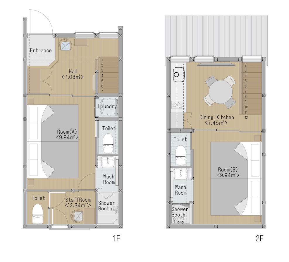 喧騒の通りから遊び疲れて戻ってきた時、安堵できる我が家のような場所であって欲しい。グローバルスタンダードな設えの中に、もてなしの心を配る。大人数で訪れることも少なくない海外旅行者向けに、収容人数は8名とし、料理も楽しめるようミニキッチンを据える。古家ゆえに快適性は欠かせない。