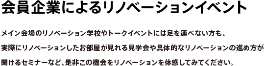 会員企業によるリノベーションイベント メイン会場のリノベーション学校やトークイベントには足を運べない方も、実際にリノベーションしたお部屋が見れる見学会や具体的なリノベーションの進め方が聞けるセミナーなど、是非この機会をリノベーションを体感してみてください。