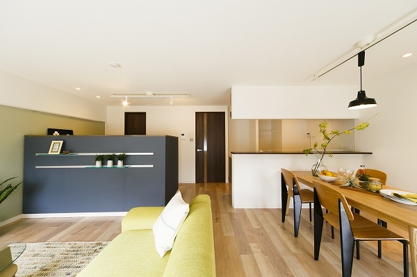 あえて仕切らない約20帖のLDKに『どこでもウォール』を設置。洋室とLDKに間にウォークスルータイプの大型収納をプランニング。