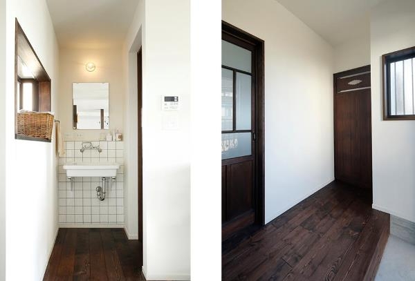 「おじいちゃんの家」をコンセプトに、昭和のレトロ感と機能美をうまく融合させることに力を注いでいます。家の主(あるじ)として生き続ける柱、それに合わせる新しい無垢材の床。アンティークの扉は、それをさらに融合させる役割を担っています。子ども時代の記憶にある床板の風合いや素朴なタイル、何度も塗装を重ねた玄関扉など、Y様と一緒にイメージを具体的に詰めていきました。