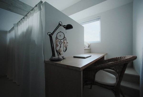 寝室はベッドマットの広さで1メートル床を上げ、その下をクローゼットにする。ベッドヘは階段で上がり、その階段の途中を机にしました。