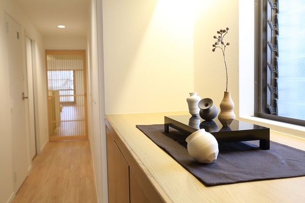 賃貸物件に長くお住まいで、「持家を持つなら、行きつけの『和食屋』の雰囲気にしたい」とご希望だった施主さま。間取りの自由度が少ない中でも、キッチンの壁を取り払い、廊下のスペースも取り込んで、広々としたLDKを実現しました。オリジナルで製作したL字型のキッチンやキッチンカウンターの面材は檜で統一。また、リビングの壁面収納にも檜や竹を使い“飾る”収納に。キッチンの梁下にはR型で丸みをつけた壁や飾り窓をつけるなど、空間に柔らかい印象をプラス。室内のいたるところで和の演出を施しました。「行きつけの和食屋の雰囲気が新居で実現できるとは思わなかった」という施主さま。細かな仕様の一つ一つに込めた和の要素を気に入っていただき、「家族みんなでくつろげる空間になりました」と話されています。
